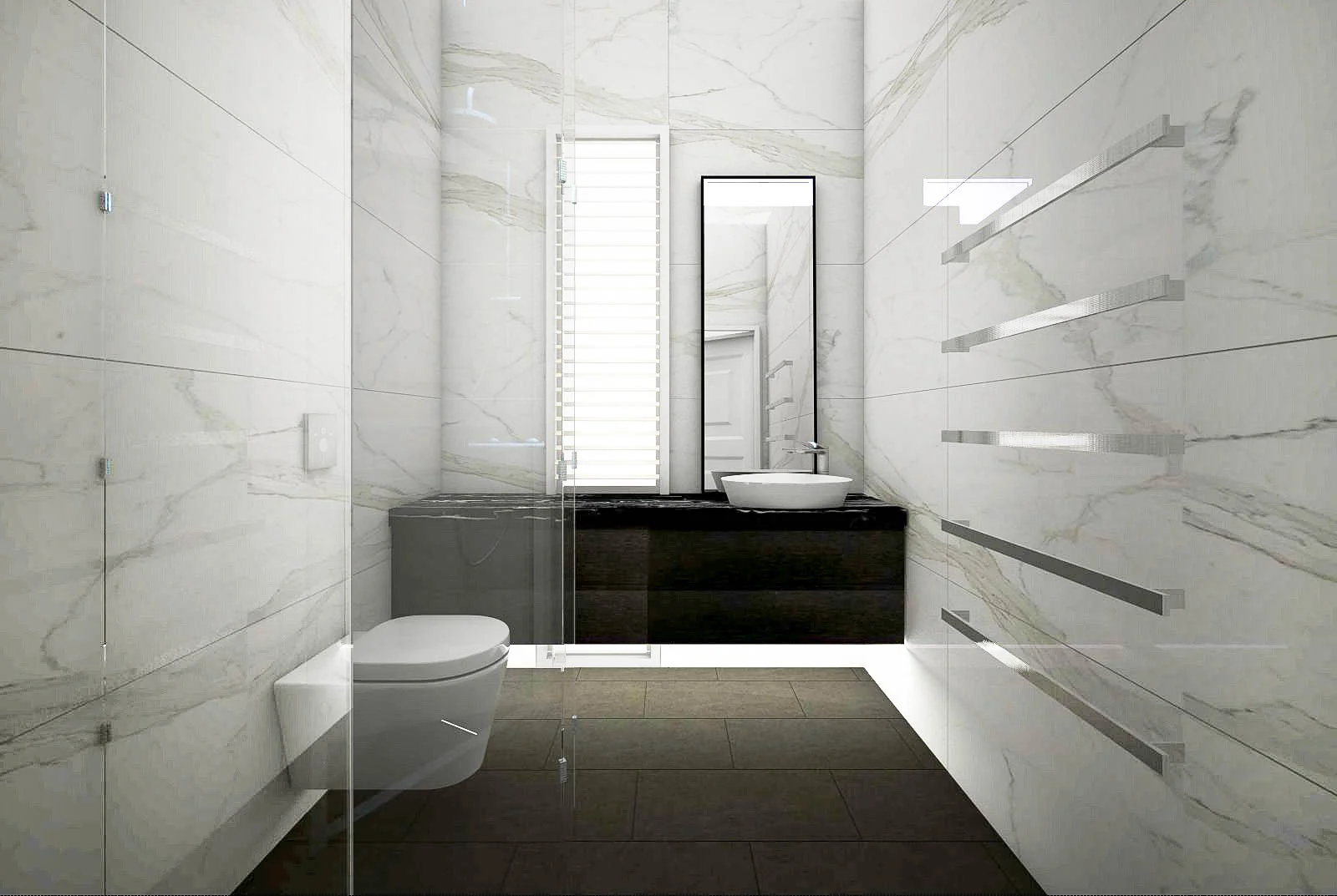 The Lukas Design render on the left is placed beside an image of the finished bathroom, demonstrating how faithfully the design vision was executed and to the highest standard.